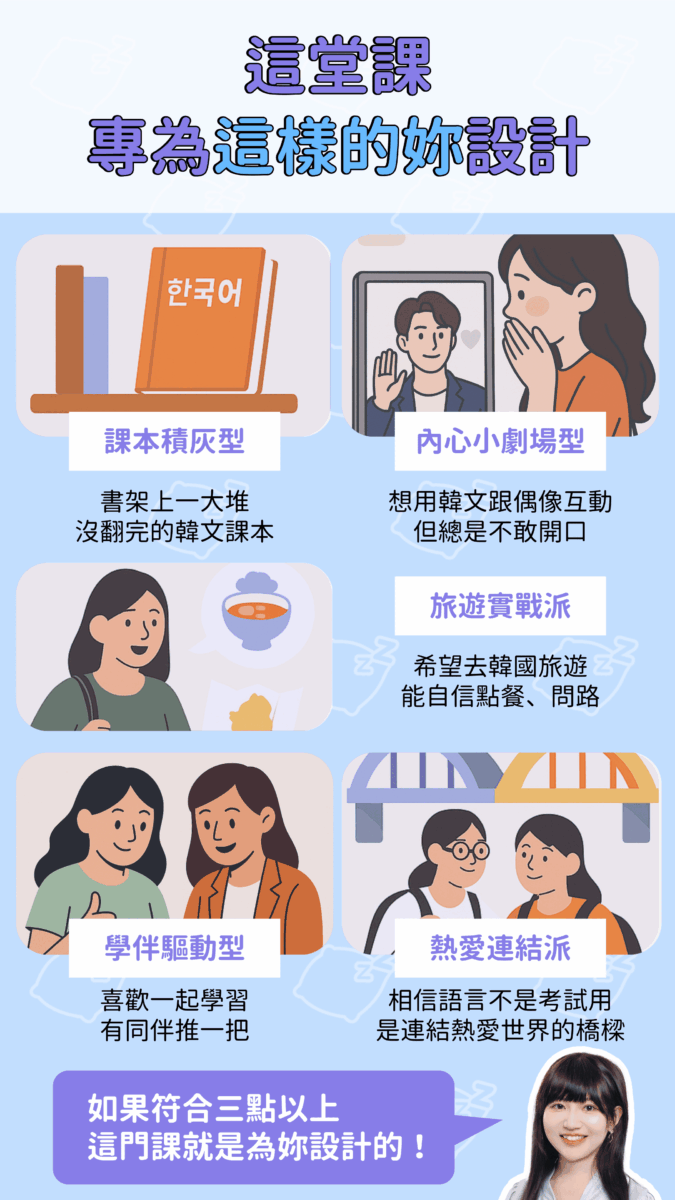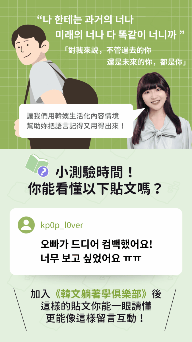 首頁 最新課程&消息 邀請你加入我的《韓文俱樂部》! 邀請你加入我的《韓文俱樂部》!Regina最新課程&消息 標籤# 初級韓文# 韓文口說# 韓文單字# 韓文學習# 韓文課程 Regina 上一 文章 帥到超想嫁給他!粉絲必學的13句韓文稱讚大全